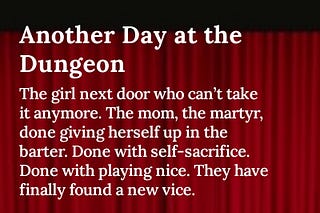 The girl next door who can’t take it anymore. The mom, the martyr, done giving herself up in the barter. Done with self-sacrifice. Done with playing…